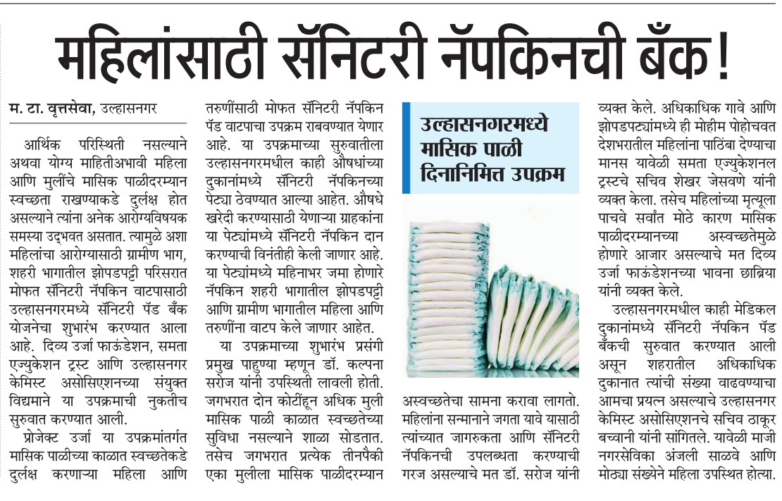 Divine Urja Foundation : Sanitary Pad Drive by PADMASHRI DR. KALPANA SAROJ, CHAIRPERSON OF THE KAMANI TUBES LIMITED